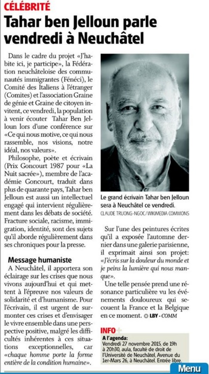 Tahar ben Jelloun parle vendredi à Neuchâtel
