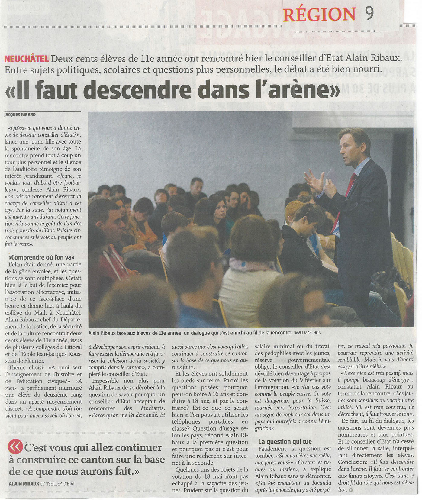 Alain Ribaux " il faut descendre dans l'arène" Deux cents élèves de 11e année ont rencontré hier le conseiller d'Etat Alain Ribaux. Entre sujets politiques, scolaires et questions plus personnelles, le débat a été bien nourri.