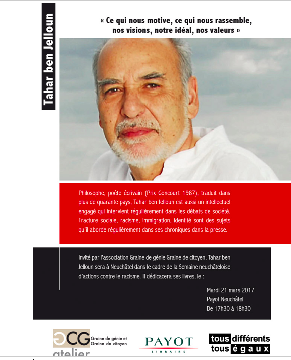 Invité par l’association Graine de génie Graine de citoyen, Tahar ben Jelloun sera à Neuchâtel dans le cadre de la Semaine neuchâteloise d’actions contre le racisme.