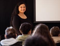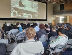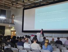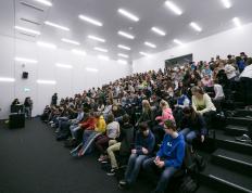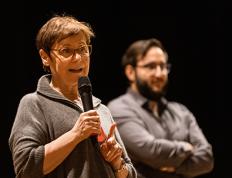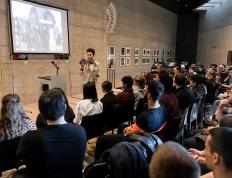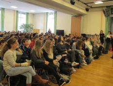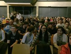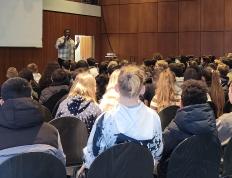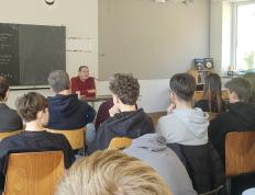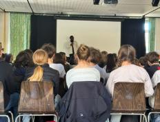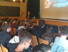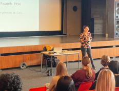 28 mars - Les élèves du lycée Blaise-Cendrars à La Chaux-de-Fonds ont écouté attentivement aujourd'hui la conférence donnée par Hélène Dumas, où elle parle de sa recherche sur l'histoire du génocide des Tutsis.