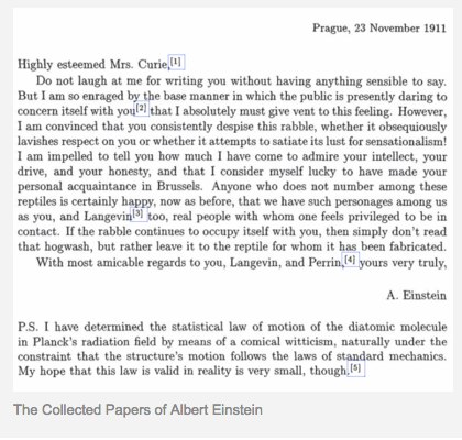 Il y a plus de 100 ans, Albert Einstein donnait des conseils à Marie Curie pour combattre les "trolls". Preuve qu'ils existent depuis longtemps... et qu'il est facile de les ignorer. Non, les trolls ne sont pas un problème nouveau. Non, ils ne sont pas non plus une créature née des entrailles de l'Internet mondial. Le troll est ancien. Il a toujours été tapi, là, dans l'ombre. Preuve en est de cette lettre (voir ci-dessous) écrite par Albert Einstein à Marie Curie en... 1911! À l'époque, le plus célèbre des scientifiques apportait à sa consoeur -victime de critiques particulièrement acerbes- tout son soutien. Il en profitait aussi pour lui indiquer comment se prémunir de ces personnages malfaisants. Einstein ne les appelait pas "trolls", le terme étant récent, mais utilisait le mot "reptile". Son conseil, en revanche, est totalement actuel: "Ne lisez pas ces foutaises", écrivait-il à la scientifique de renom. A l'époque, Marie Curie, scientifique française nobélisée pour ses recherches pionnières sur la radioactivité, venait de se voir refuser un siège à l'Académie des sciences. Probablement parce que c'était une femme et qu'elle était athée, mais aussi, peut-être, à cause des rumeurs disant qu'elle était juive. Un "problème" dans la France antisémite, contemporaine de l'affaire Dreyfus. Marie Curie, récemment veuve de son mari Pierre Curie, s'était également attiré les foudres des "reptiles" à cause de sa relation avec Paul Langevin. Un physicien qui ne vivait plus avec sa femme mais toujours marié. Les trolls de l'époque l'accusaient de salir le nom de son défunt époux. "Toutes les personnes n'appartenant pas à la catégorie des 'reptiles' ne peut évidemment que se réjouir, autant aujourd'hui qu'hier, d'avoir des personnes telles que vous et Langevin parmi nous", explique l'inventeur de la théorie de la relativité générale. L'Express.fr 7.12.2014